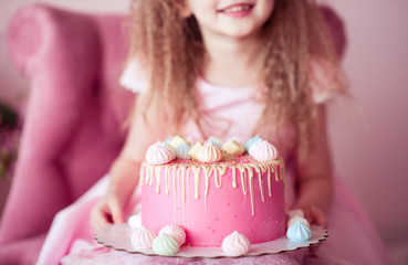 Happy Child Girl 4 5 Year Old Sitting In Chair With Birthday Cake In