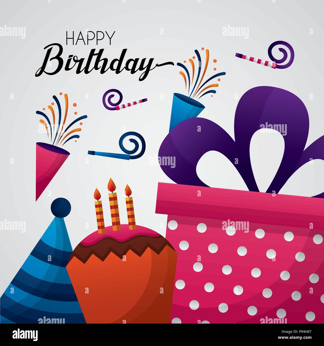 Happy Birthday Card Celebration Day Hat Party Cake Gift Box Rockets