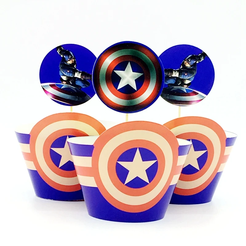 24pcs Lot Paper Cupcake Wrappers Topper Captain America Shield Theme