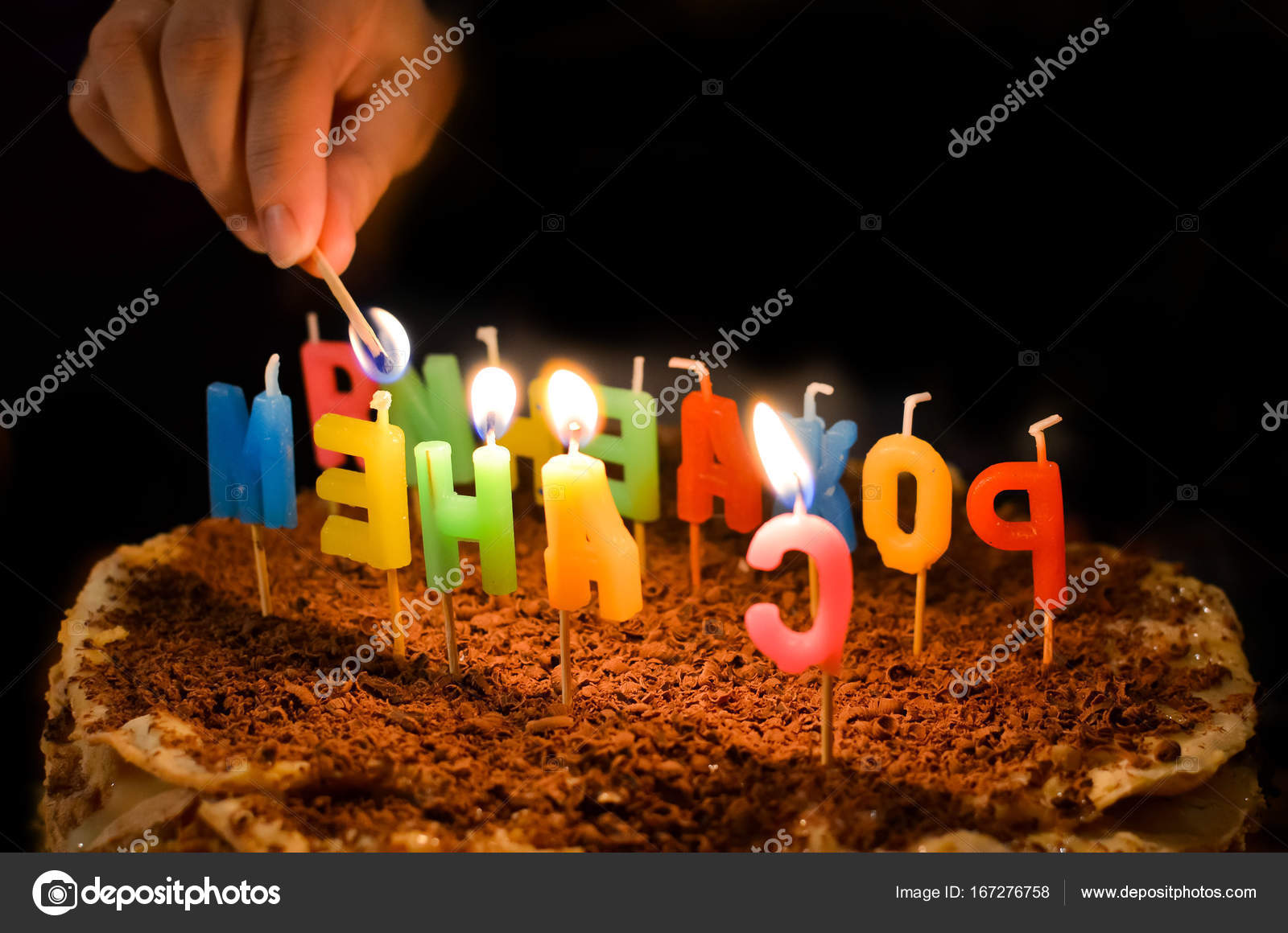 Happy Birthday Cake With Fire Candles In The Form Of Russian Letters