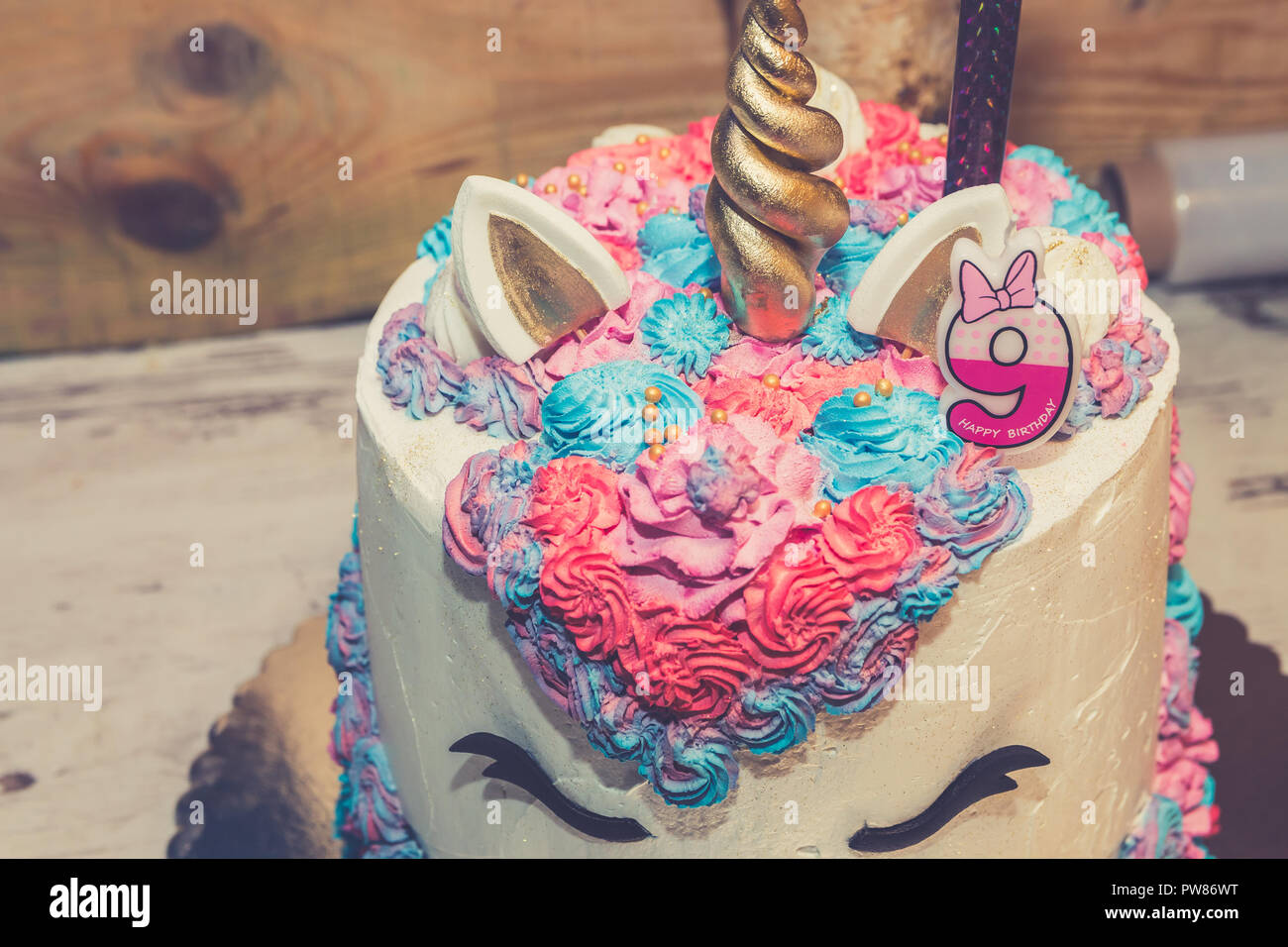 Close Unicorn Cake Little Girl Birthday Party Stock Photo
