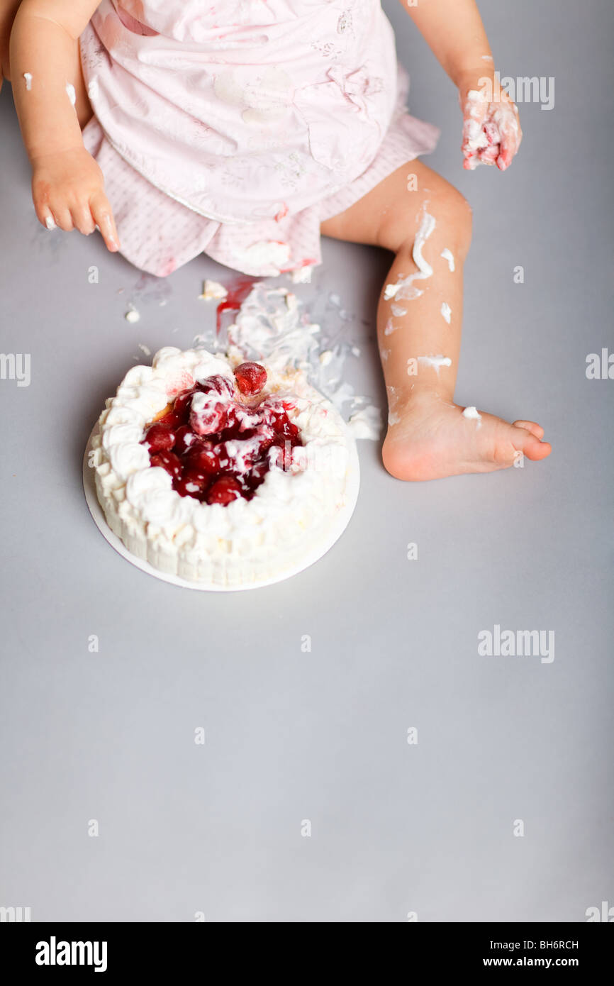 Closeup Of Little Girl Eating Her First Birthday Cake Stock Photo