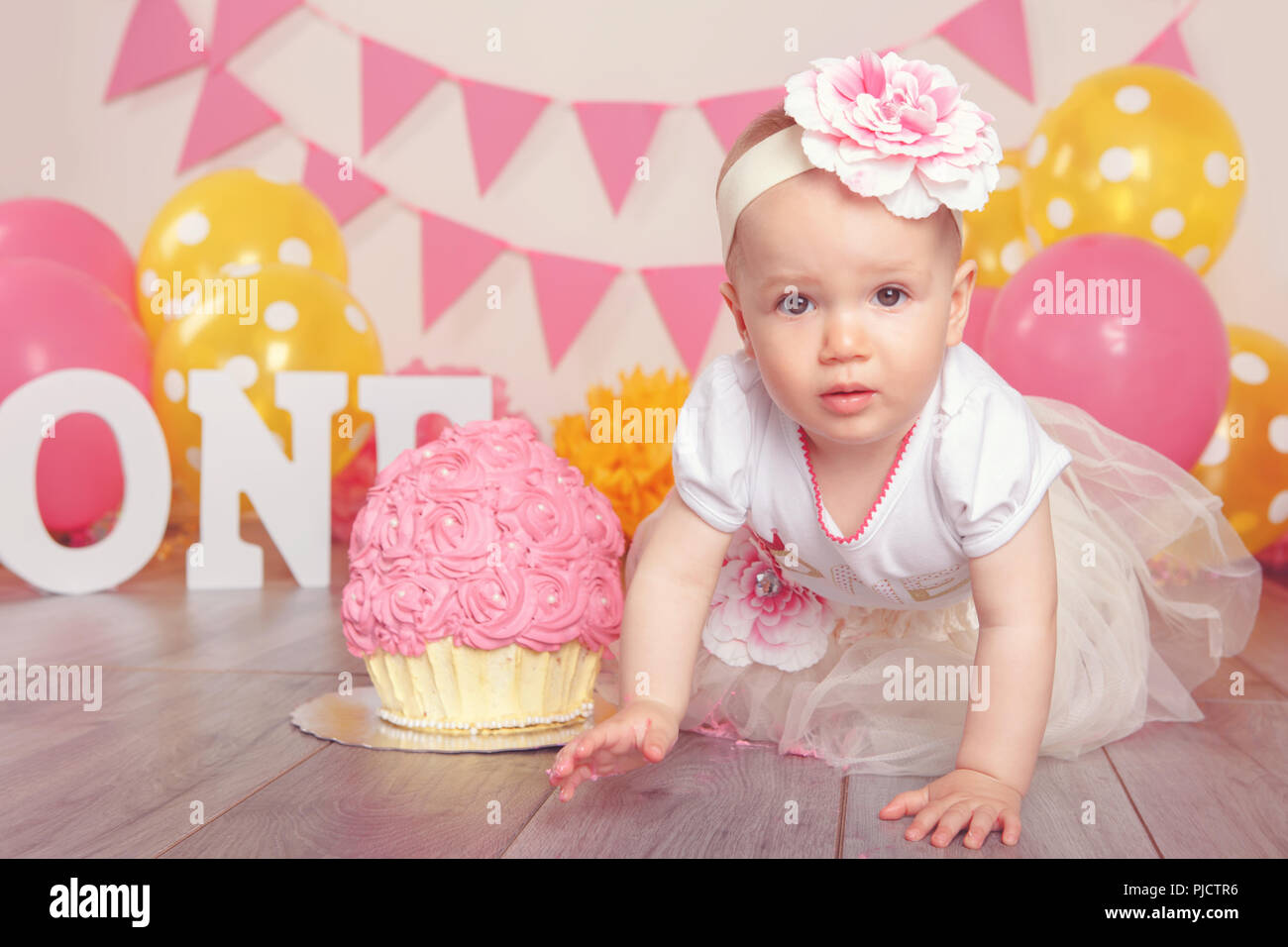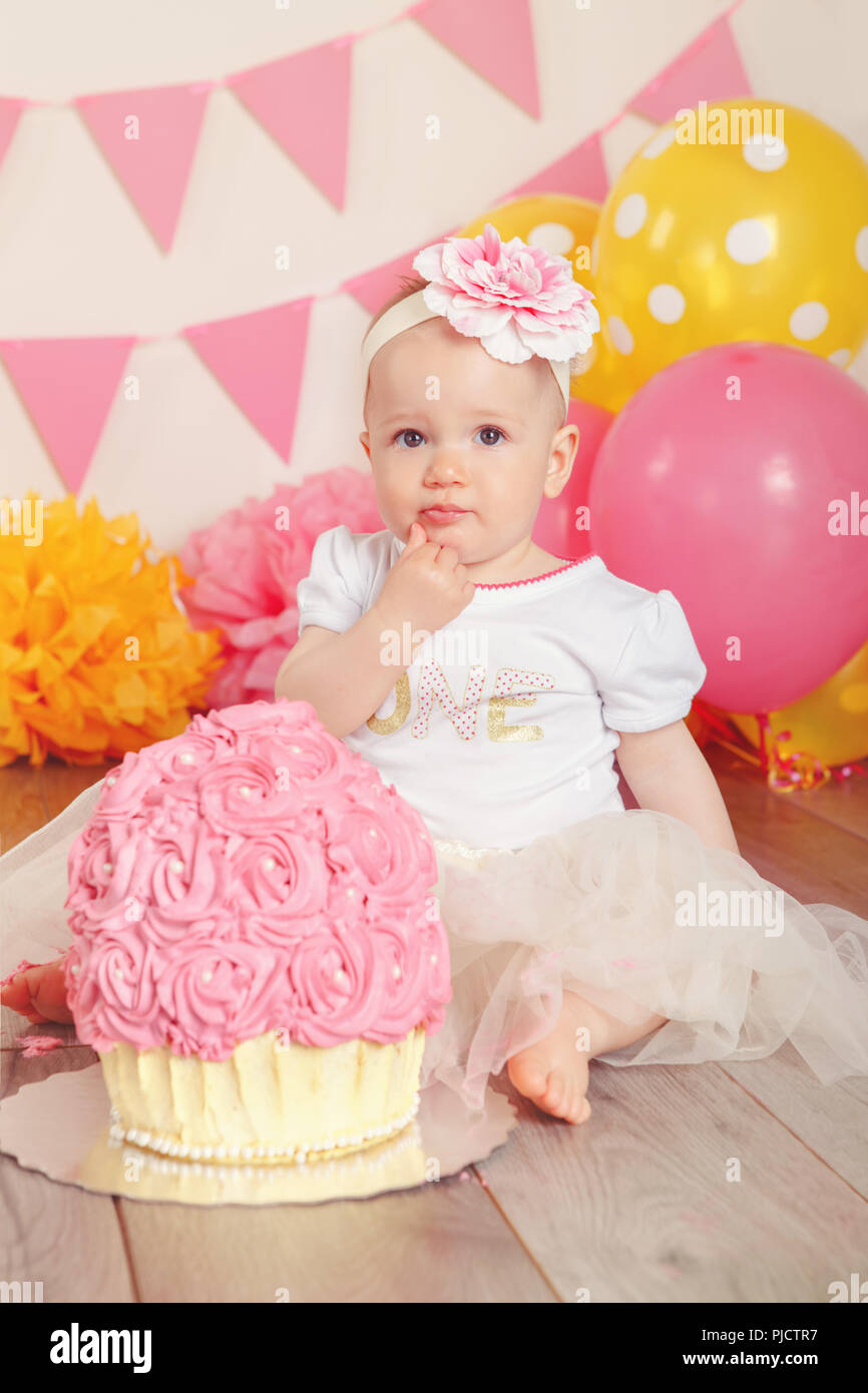 Baby Girl First Birthday Cake Smash Photo Shoot Stock Photo Picture
