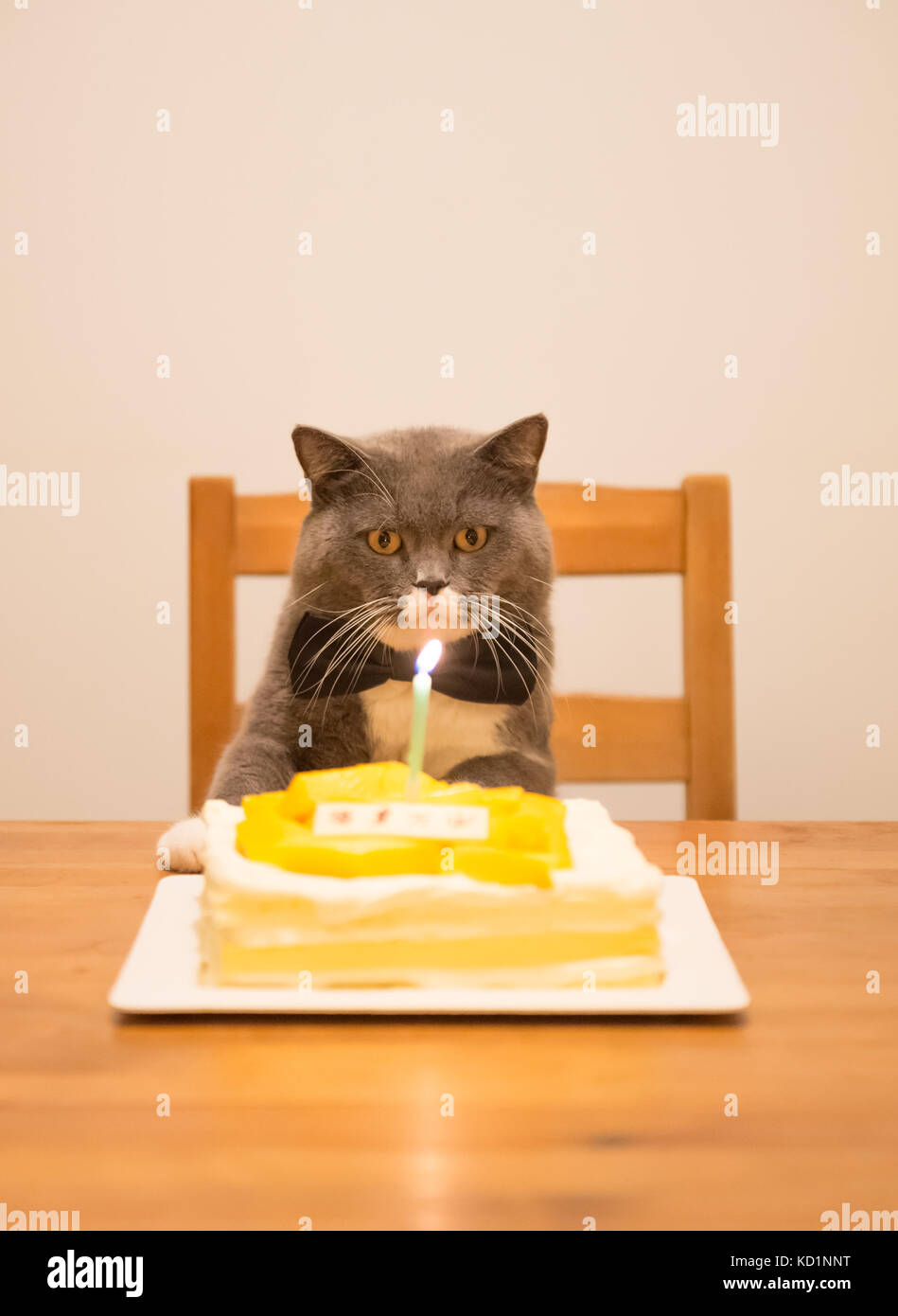 Gray British Shorthair And A Birthday Cake Stock Photo 162922868
